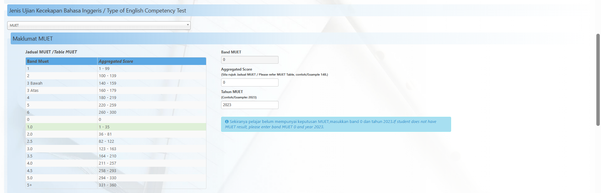 Pelajar juga dikehendaki memilih Jenis Ujian Kecekapan Bahasa Inggeris.