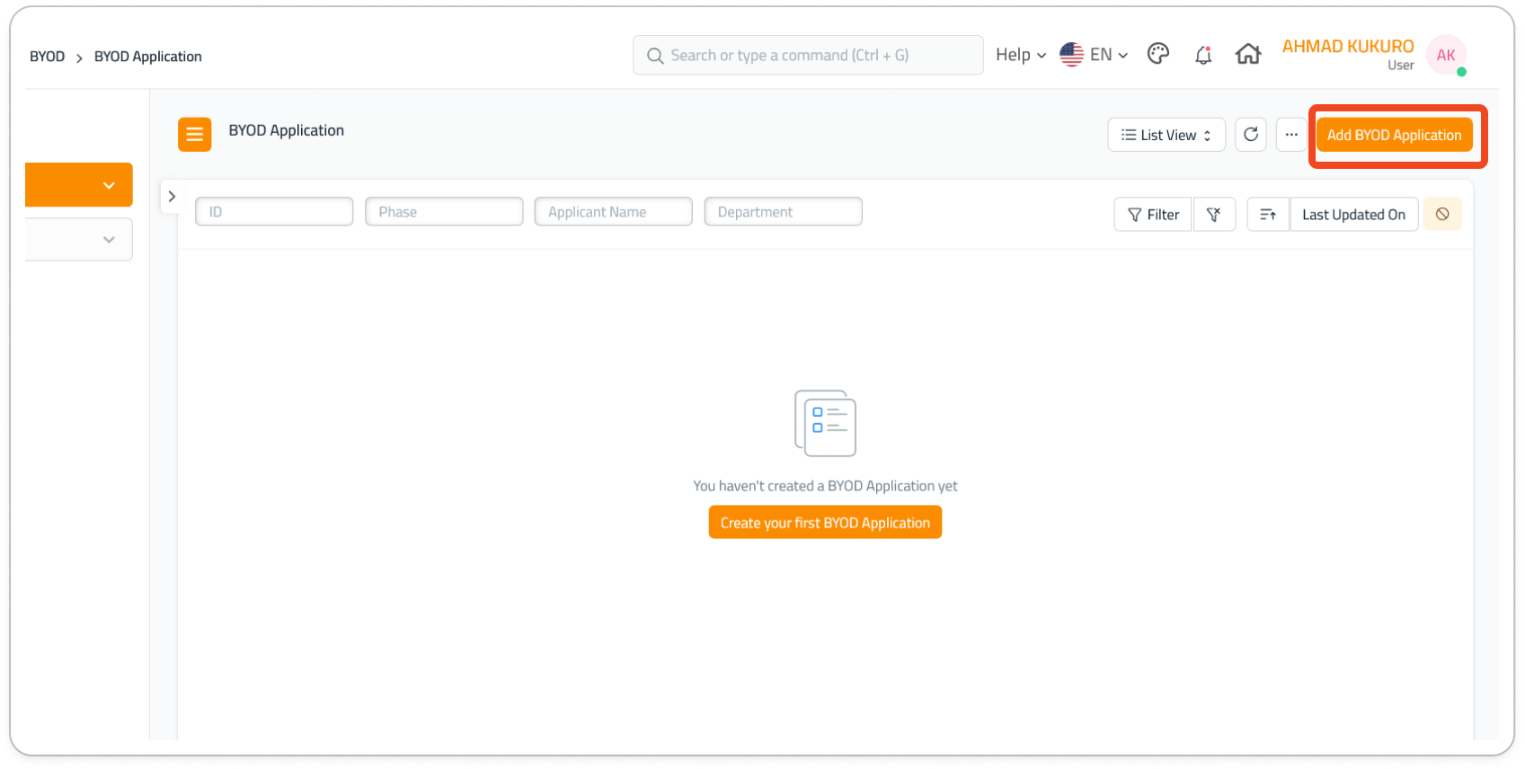 3. Klik butang Add BYOD Application untuk membuat permohonan baru.