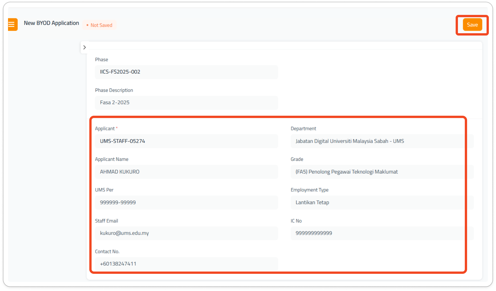 4. Sila pastikan info dalam permohonan adalah betul dan jika anda pasti sudah betul, klik butang Save.