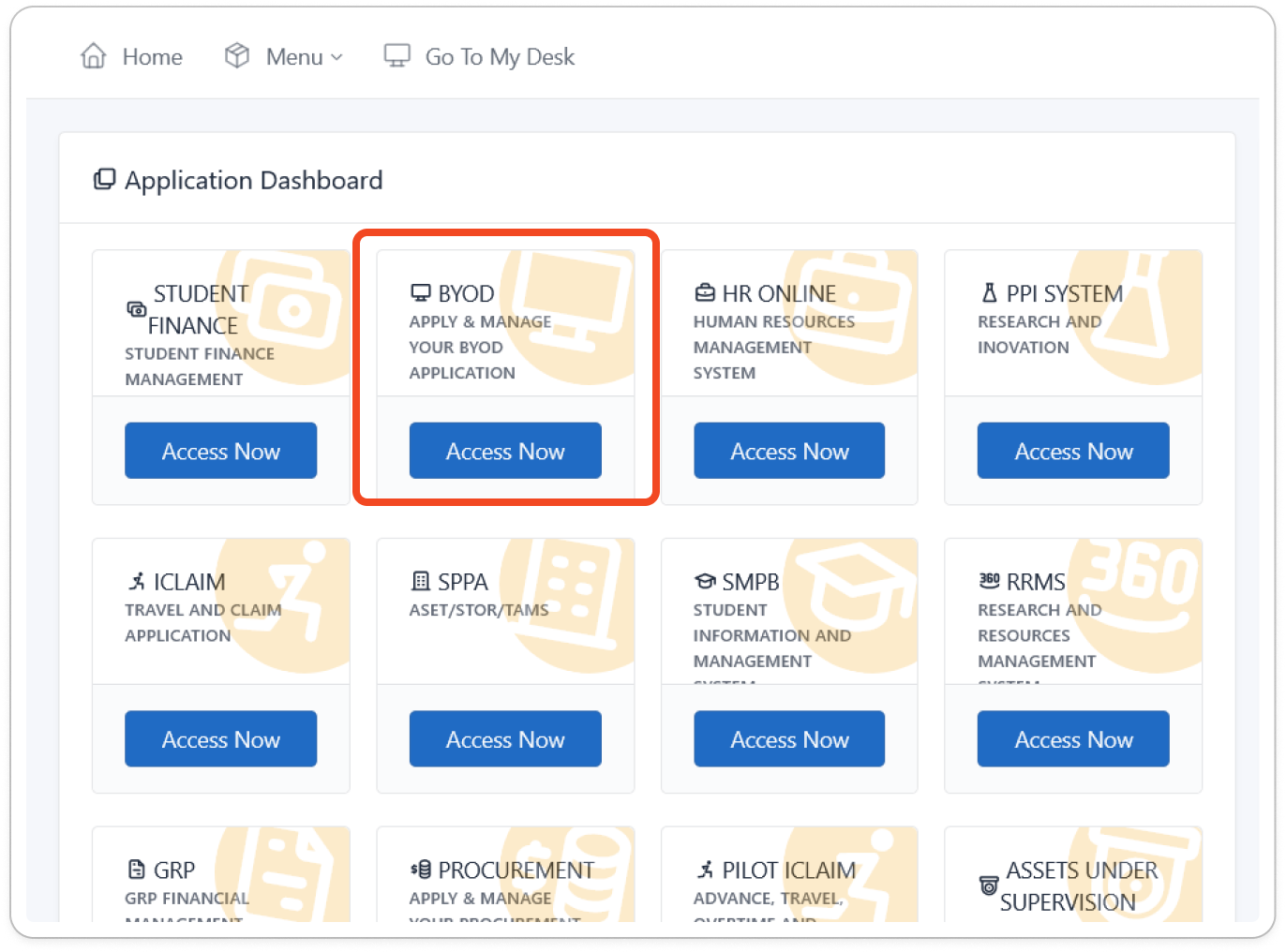 2. Pilih / klik butang "Access Now" pada bahagian BYOD dan anda akan di bawa terus ke paparan BYOD Application.