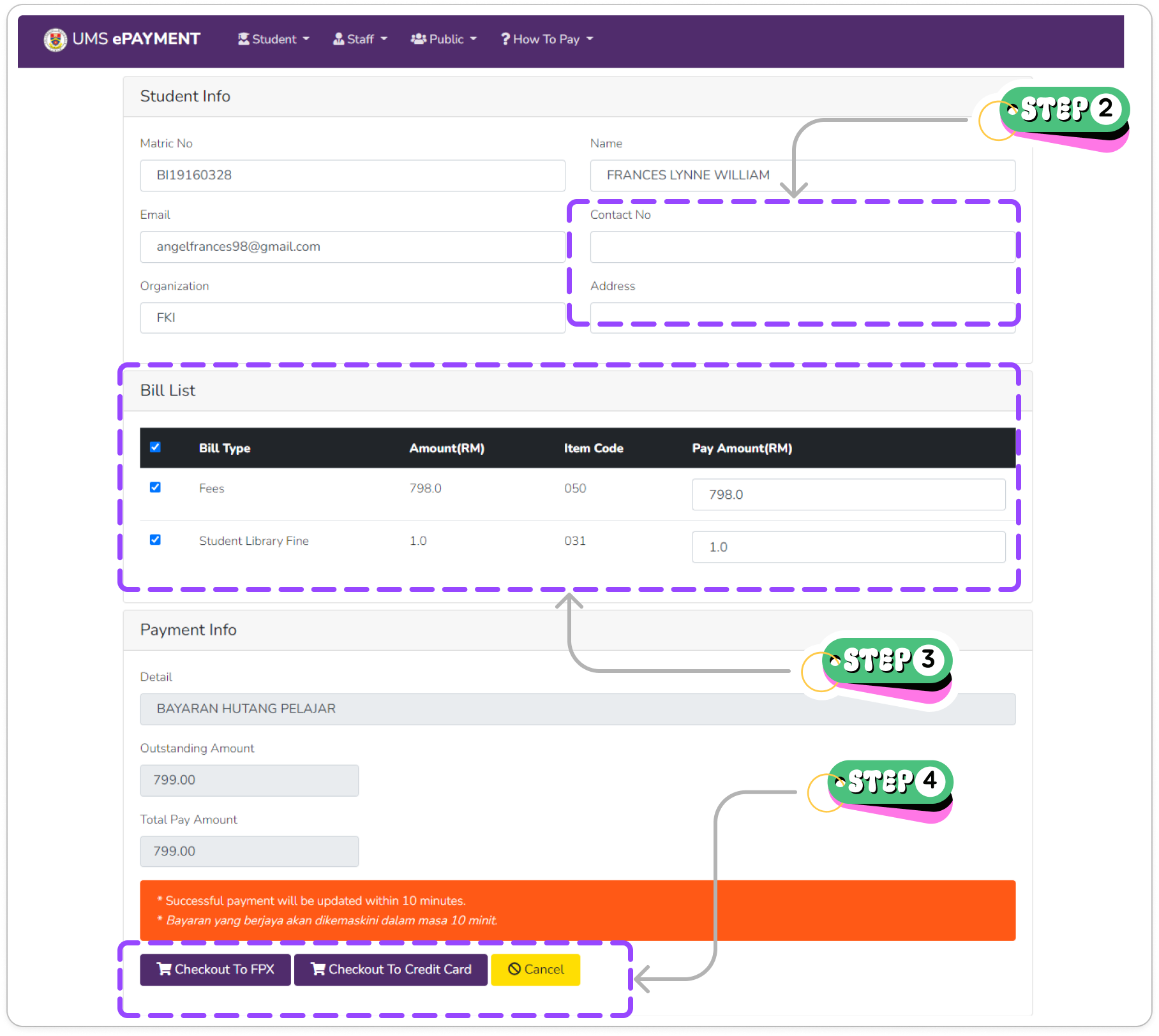 4. Di bahagian Payment Info, pilih butang Checkout to FPX untuk buat bayaran melalui FPX atau Checkout to Credit Card bagi buat bayaran menggunakan kad kredit. Bagi membatalkan bayaran klik butang Cancel.
