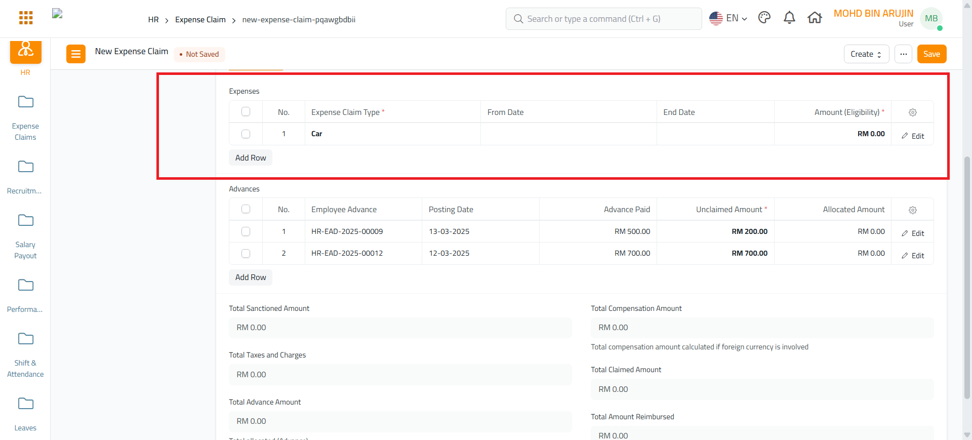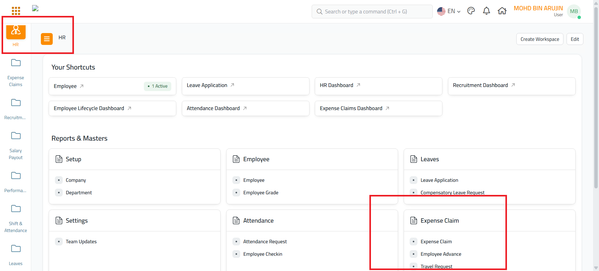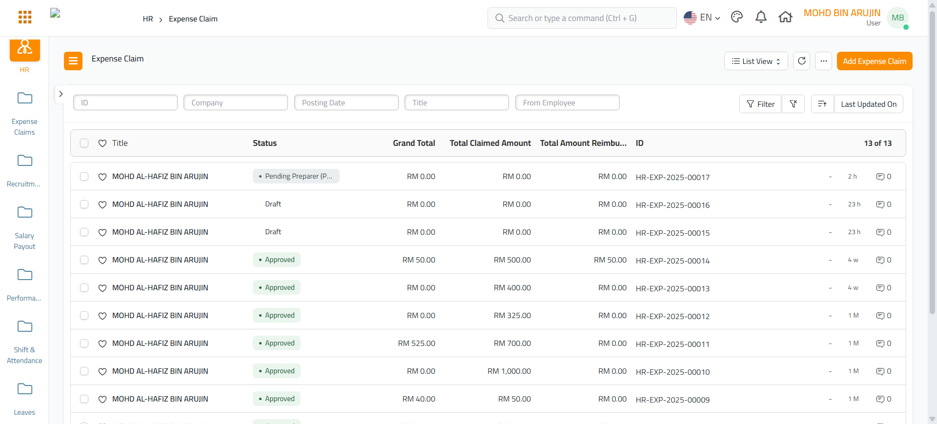 Pergi ke modul HR > Expense Claim > Expense Claim.