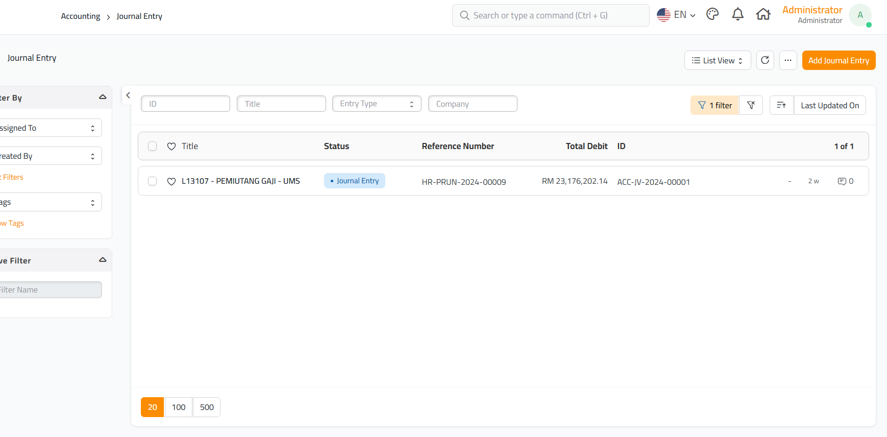- Anda akan diarahkan ke halaman Journal Entry, di mana anda boleh menyemak butiran jurnal yang telah dijana.