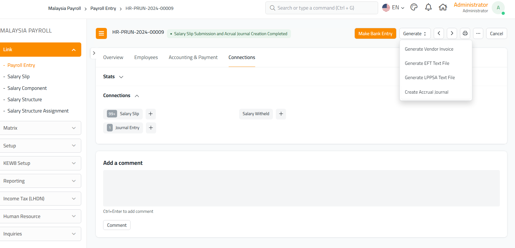 - Apabila proses berjaya, pautan ke Journal Entry akan dipaparkan di bawah seksyen Connections.