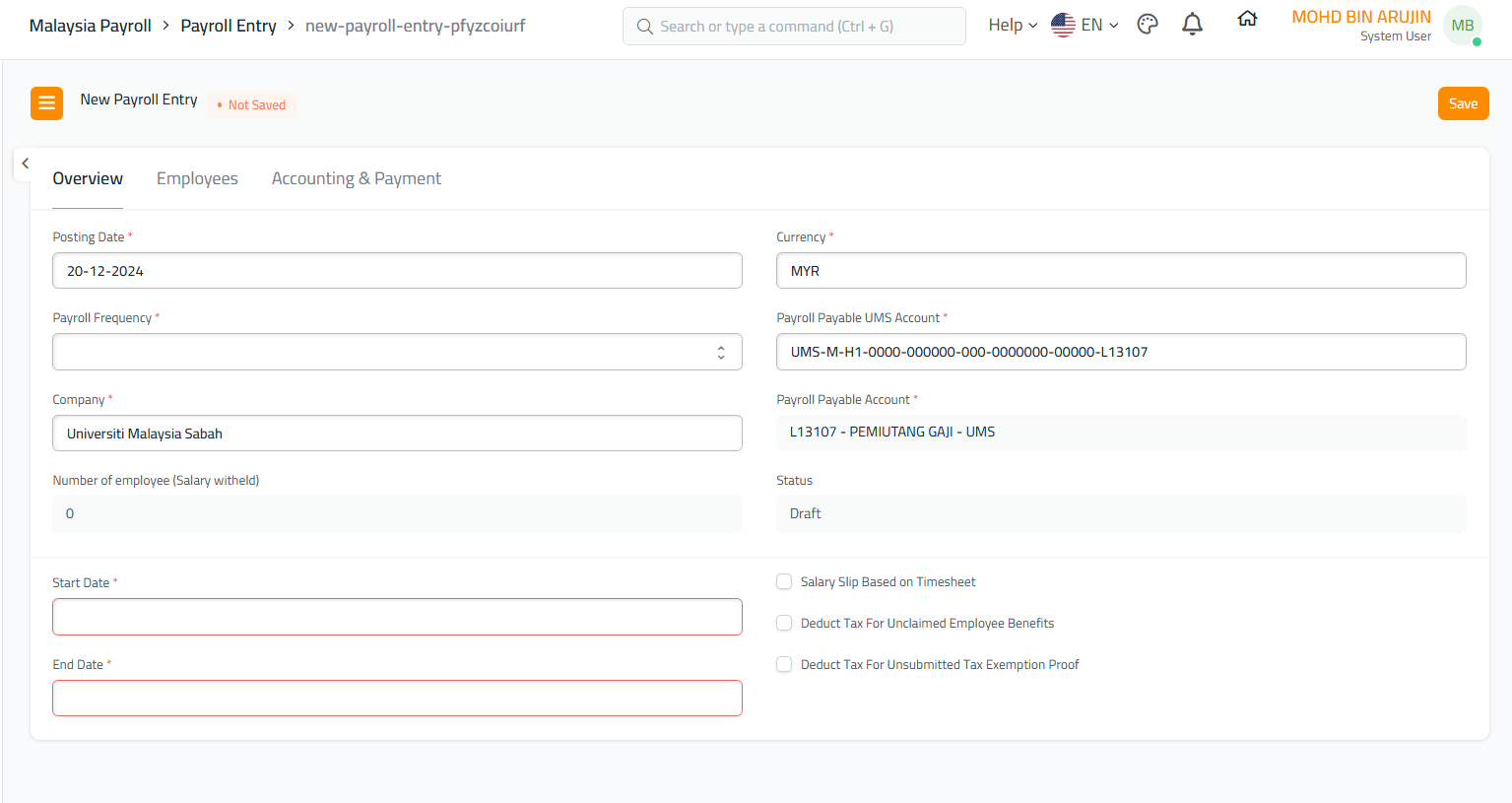 - Pergi ke senarai Payroll Entry, kemudian klik pada Add Payroll Entry.