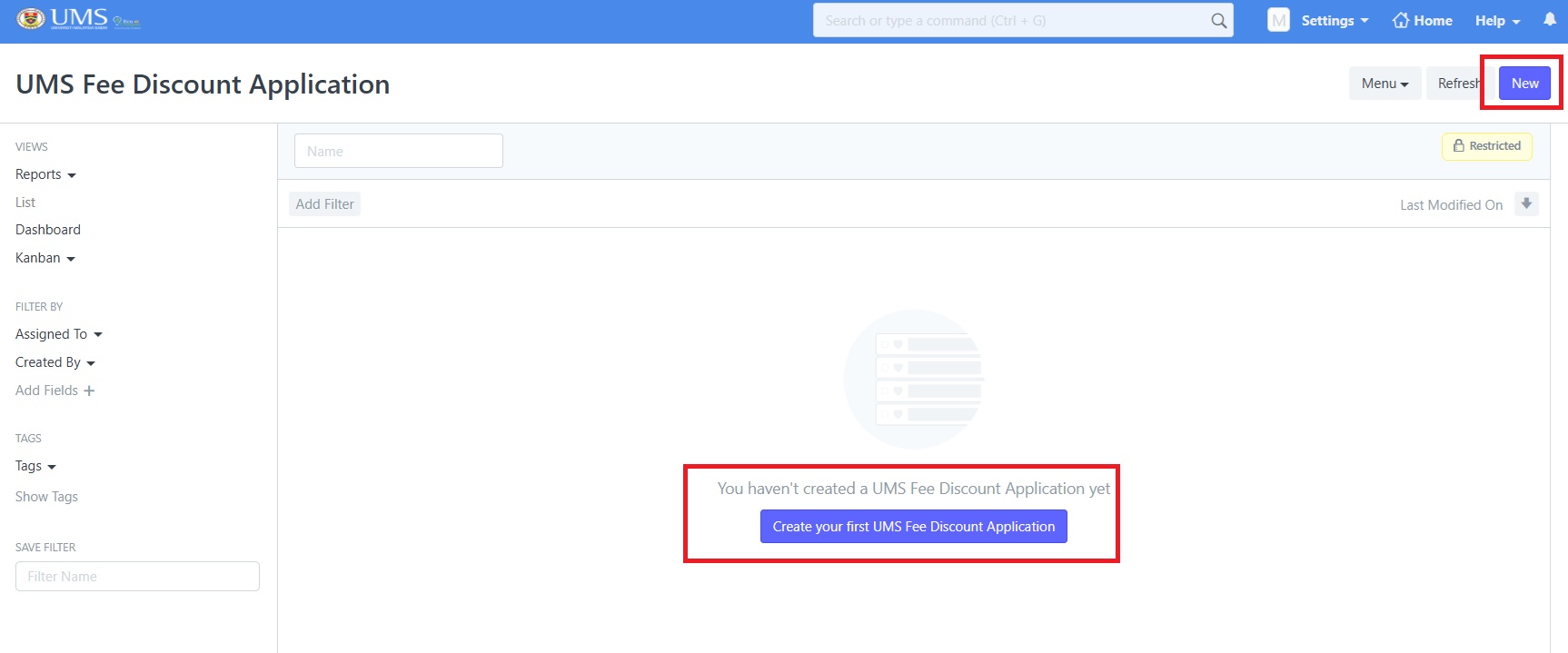 Pemohon akan dialamatkan semula ke tempat untuk memohon UMS Fee Discount Application seperti yang ditunjukan pada gambar rajah 2.0 dibawah. Klik New atau Create your first UMS Fee Discount Application untuk meneruskan permohonan.