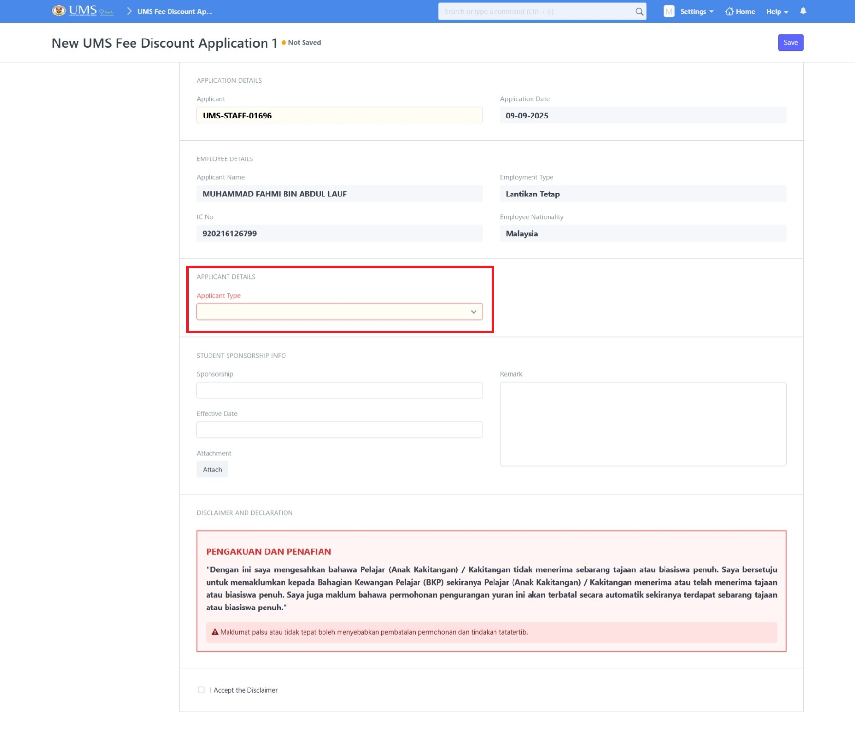 Pemohon perlu tentukan jenis permohonan adalah diri sendiri (self) ataupun untuk anak tangungan (child) dengan menekan Application Type. Sistem akan mengambil maklumat yang diperlukan secara otomatik. Sekiranya memilih untuk anak tangungan dan mempunyai senarai anak lebih dari satu, pemohon perlu memilih anak dari senarai yang tertera. Selepas itu, baca PENGAKUAN DAN PENAFIAN dibawah dan klik I Accept the Disclamer untuk setuju. Klik Save untuk menyimpan permohonan.