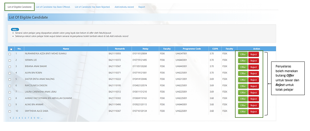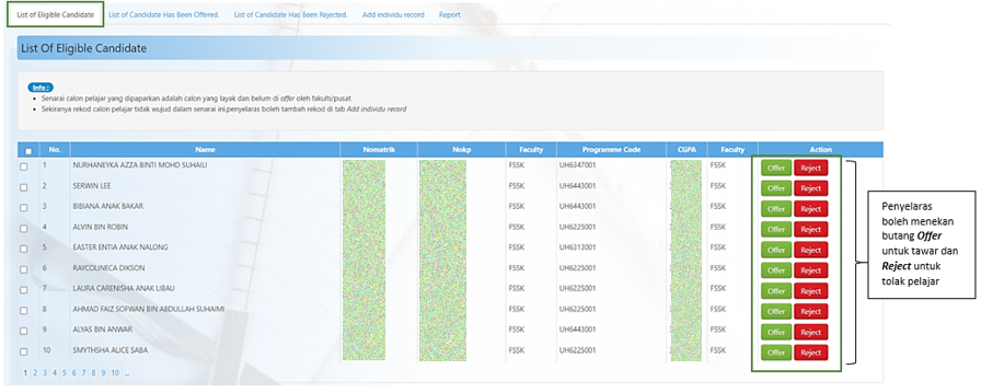 Paparan ini adalah senarai calon yang layak dan belum di offer mahupun di Reject oleh fakulti pusat.