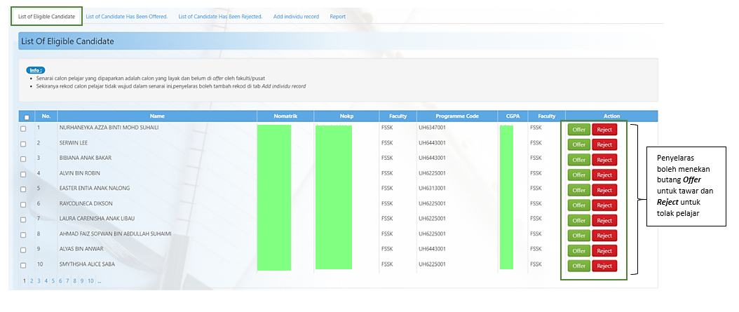 Paparan ini adalah senarai calon yang layak dan belum di offer mahupun di Reject oleh fakulti pusat.