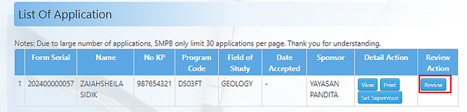 Butang Review pada List of Application pula adalah untuk memaparkan ringkasan Application Details dan untuk Follow up action kemudian menekan Update Status.