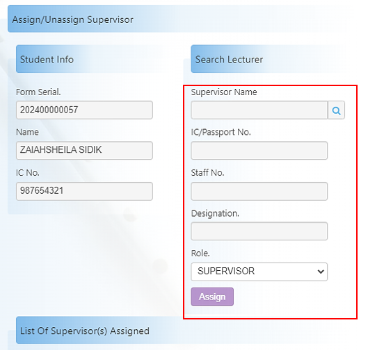 Paparan ini adalah untuk menetapkan penyelia bagi pelajar dengan mencari Supervisor Name dan Role, seterusnya menekan butang Assign.