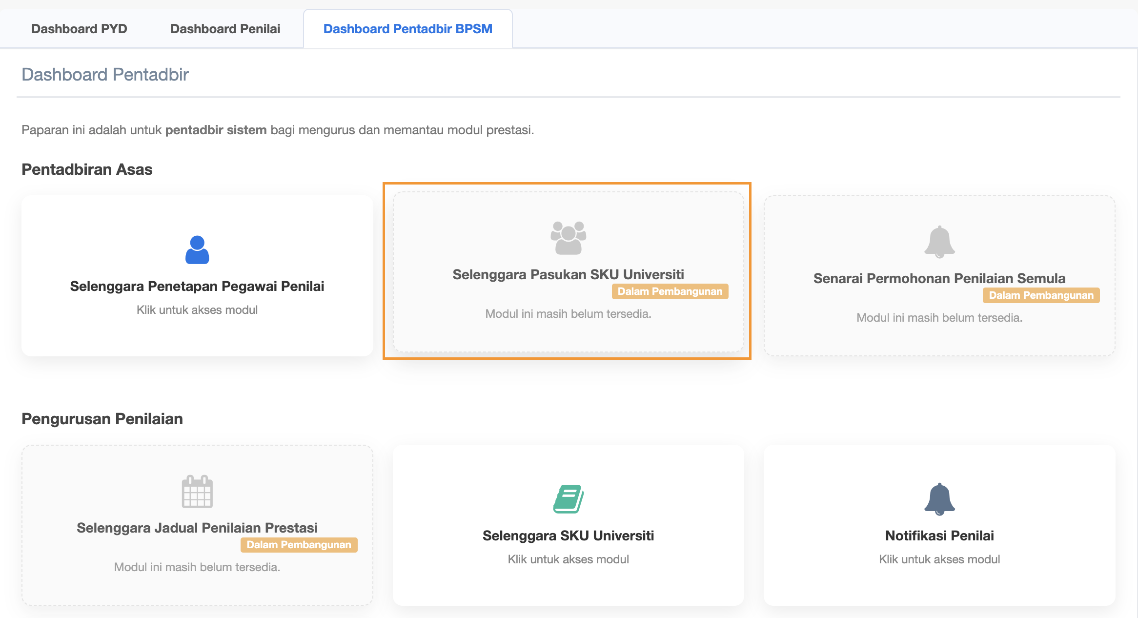 Dashboard Pentadbir BPSM - Selenggara Pasukan SKU Universiti