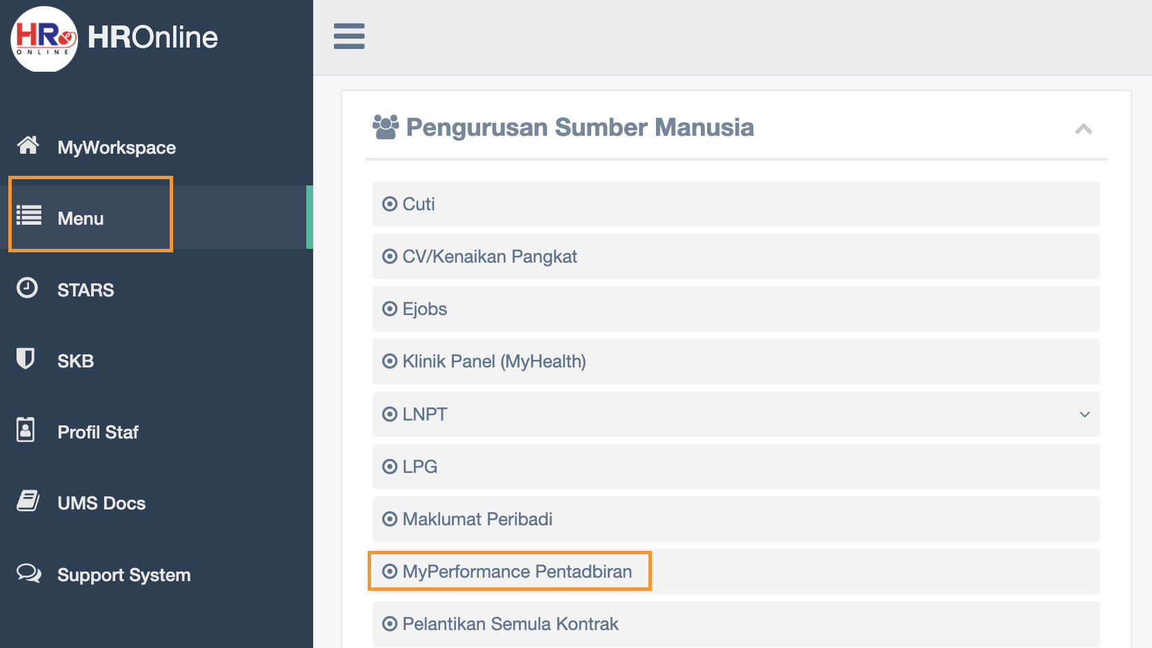 Click Menu then click MyPerformance Pentadbiran
