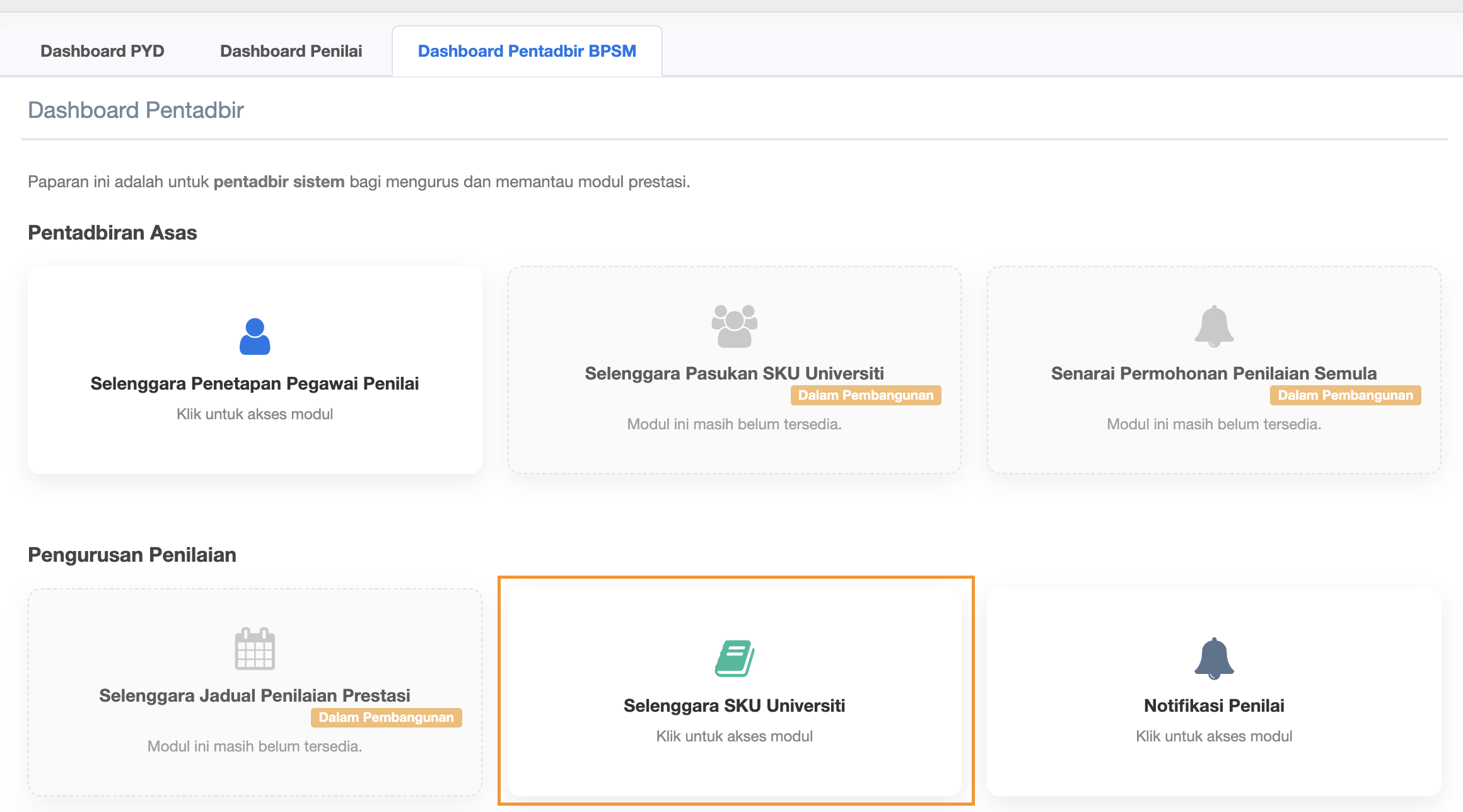 Dashboard Pentadbir BPSM - Selenggara SKU Universiti