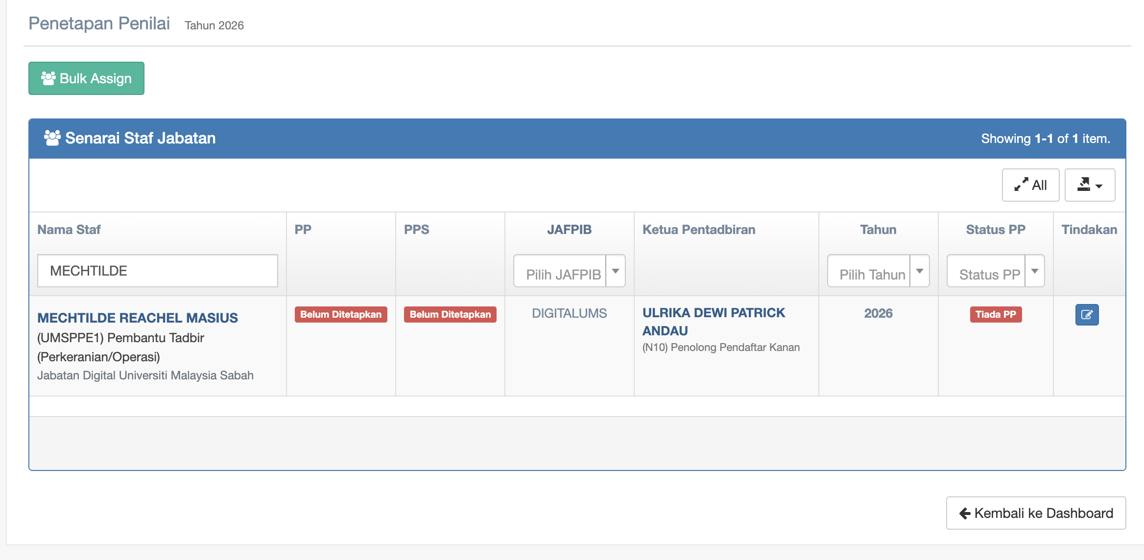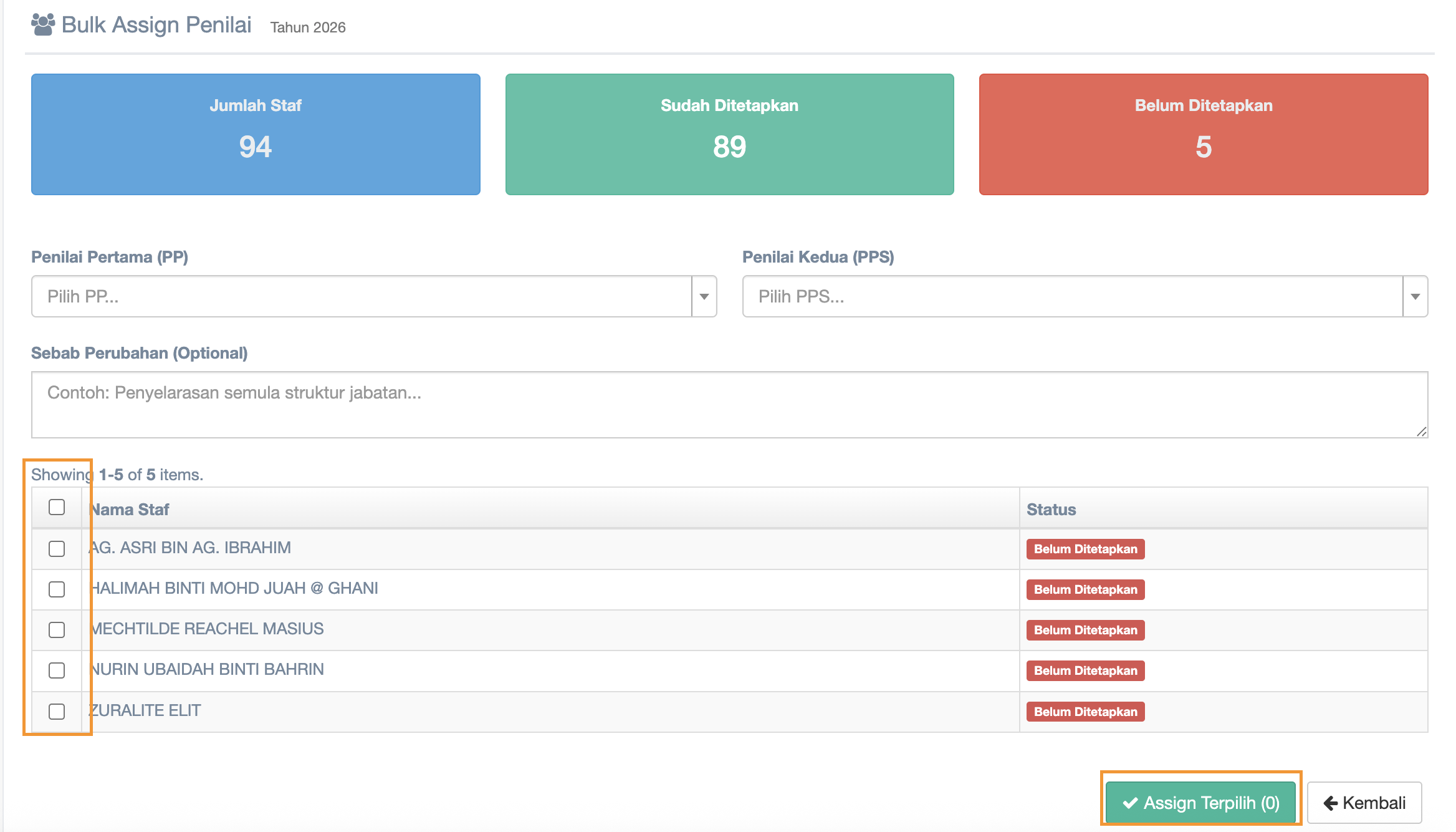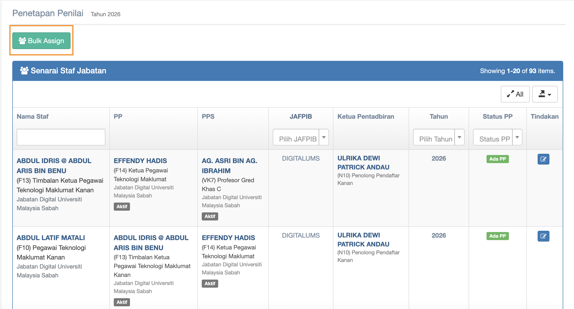 In Bulk Assign you can choose more than 1 staff to Penilai Pertama(PP) and Penilai Kedua (PPS)