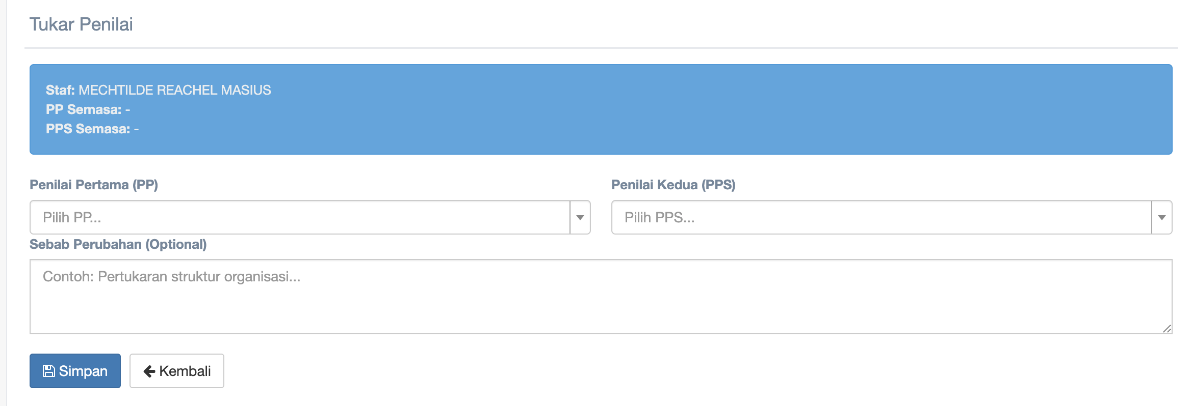 Step 9 : Click the dropdown of Penilai Pertama (PP) and Penilai Kedua (PPS) to choose
