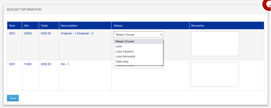 8. In Budget Information, select the Status of the project details, enter Remarks and click Save button.