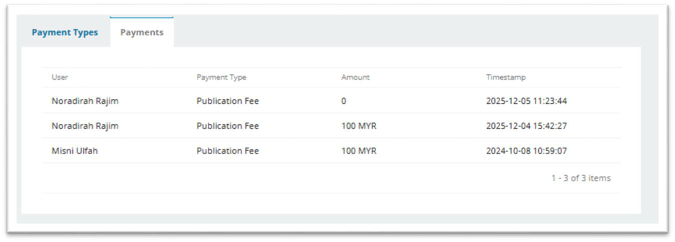 a) Senarai rekod pembayaran. Amaun 0 jika artikel berstatus “Waived” dan RM100 jika artikel berstatus “Paid”.