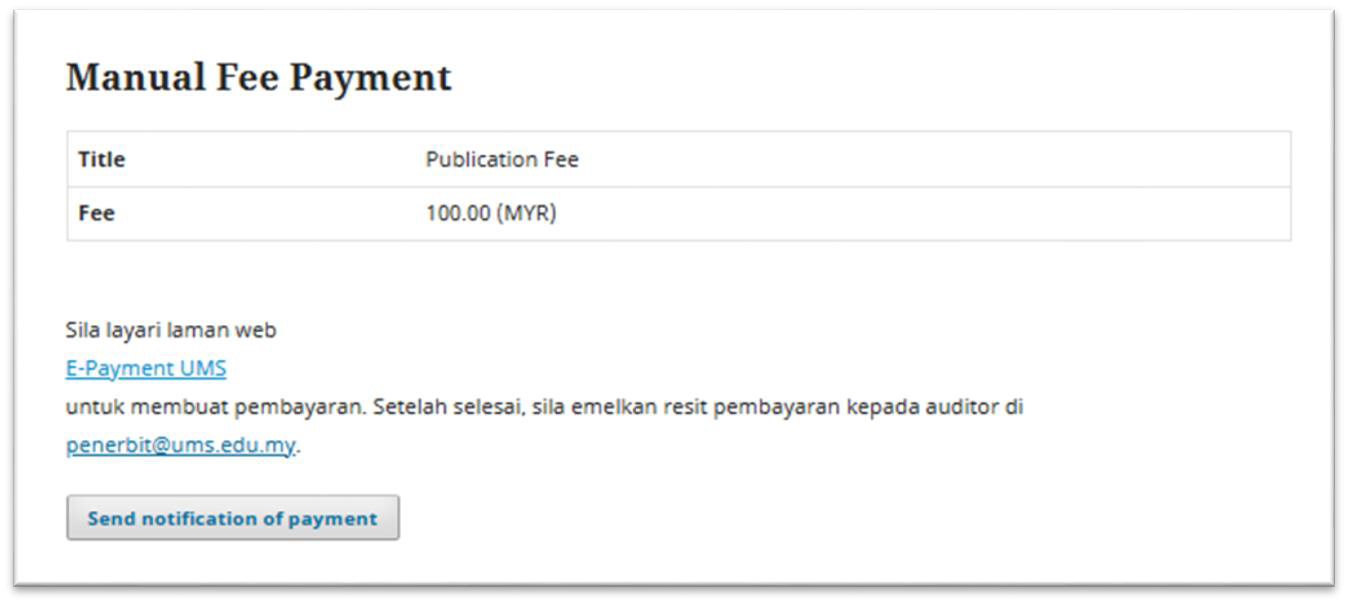 c) Selesai membuat pembayaran, Author tekan butang “Send notification of payment” untuk menghantar notifikasi kepada Admin Jurnal