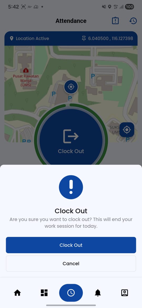 1. For clock in, since after login you will be redirect into dashboard screen. You need to go to the tab shown in picture to go to clock in screen