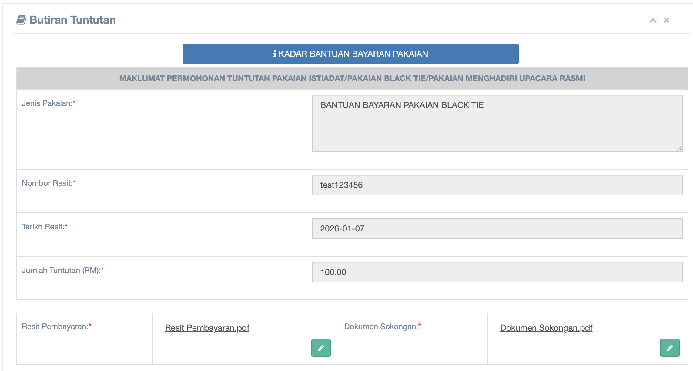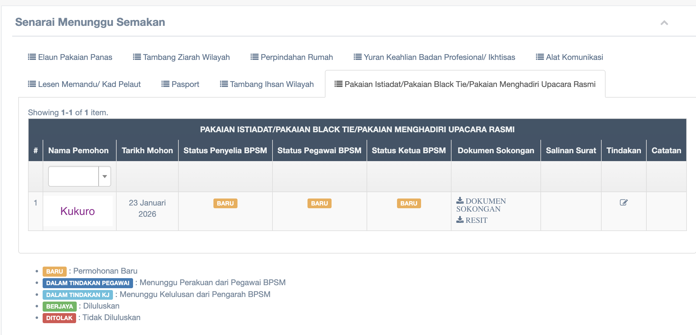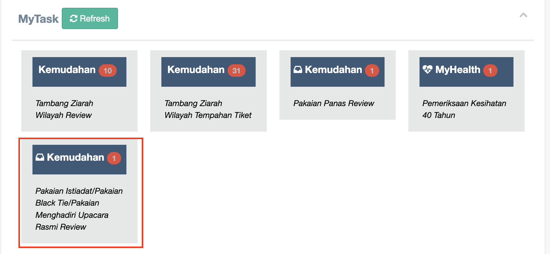 Step 1 : Click Refresh Green button and Check your notification then click to open the Kemudahan - Pakaian Istiadat / Pakaian Black Tie / Pakaian Menghadiri Upacara Rasmi