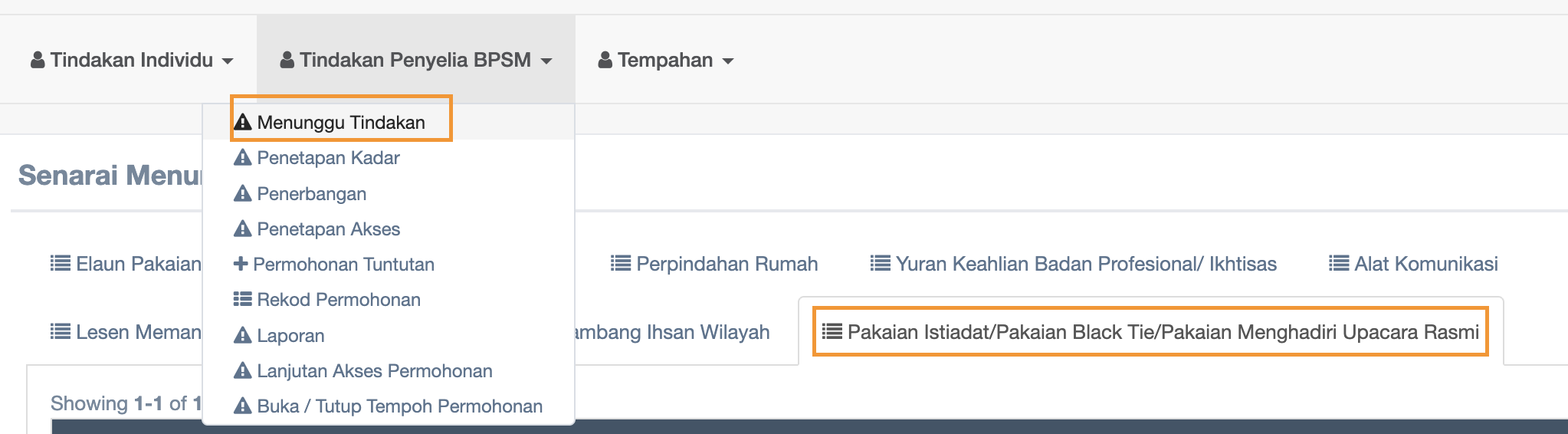 Step 2 : Click the menu Menunggu Tindakan then click Pakaian Istiadat/Pakaian Black Tie/Pakaian Menghadiri Upacara Rasmi tab